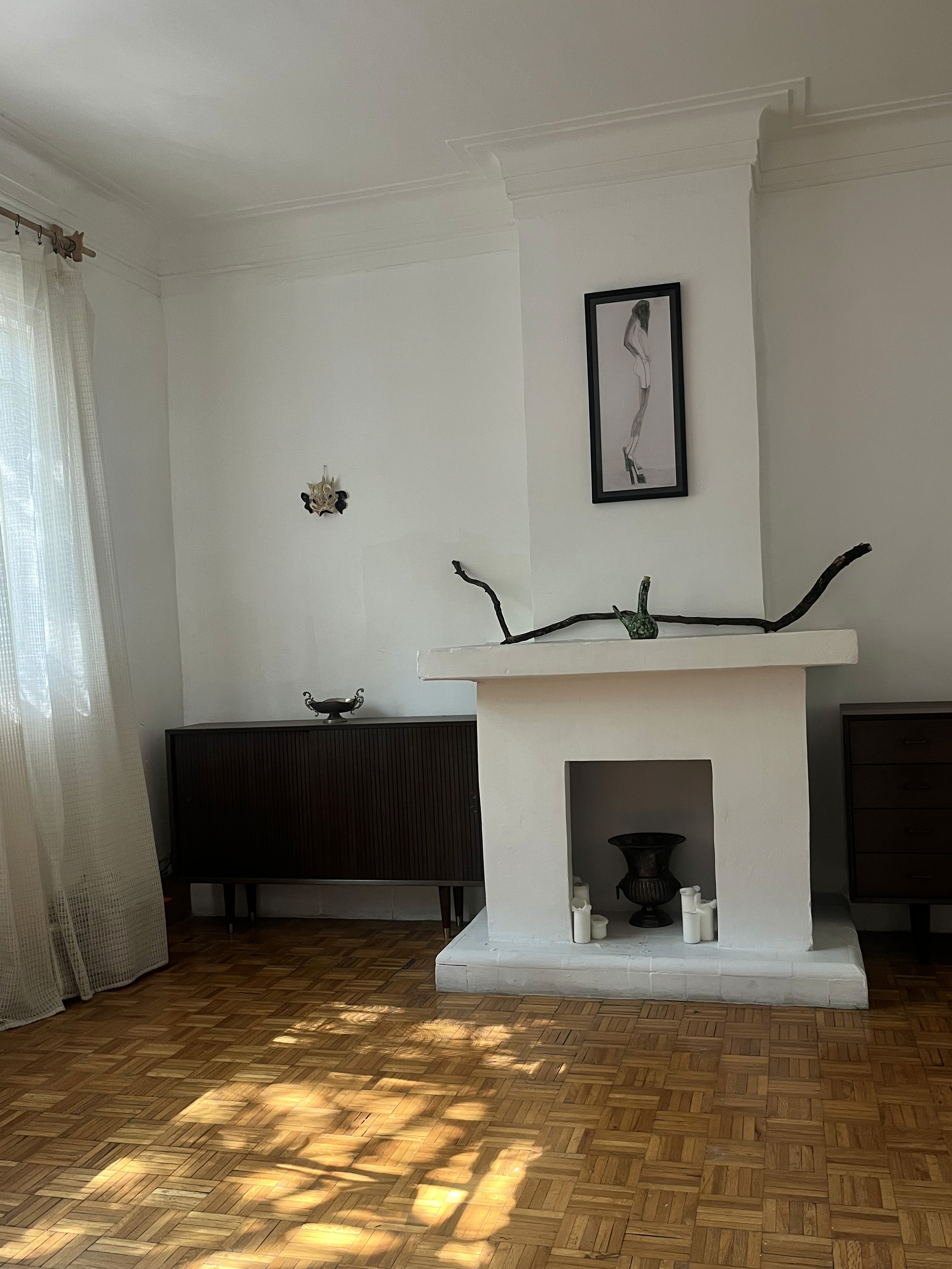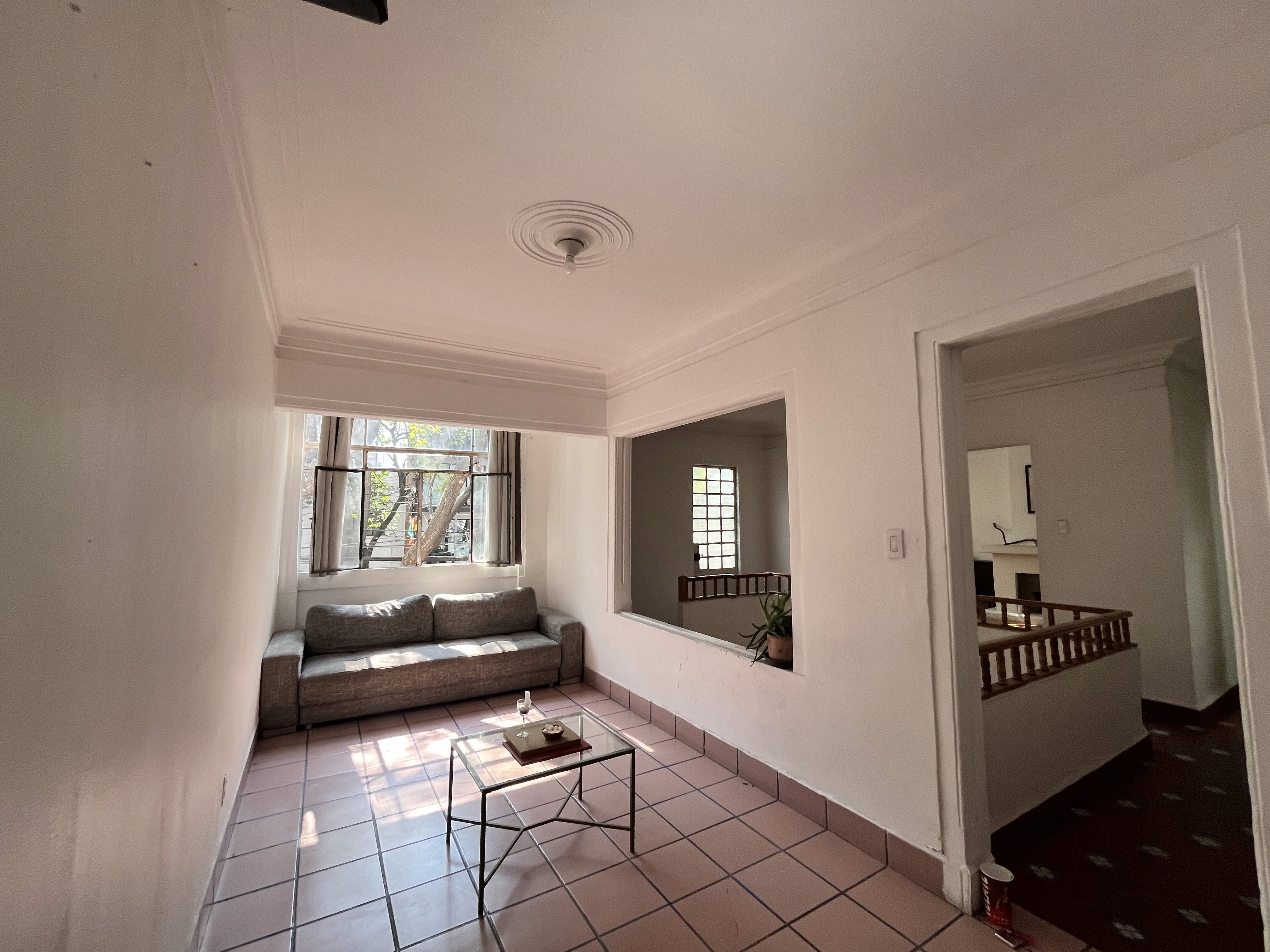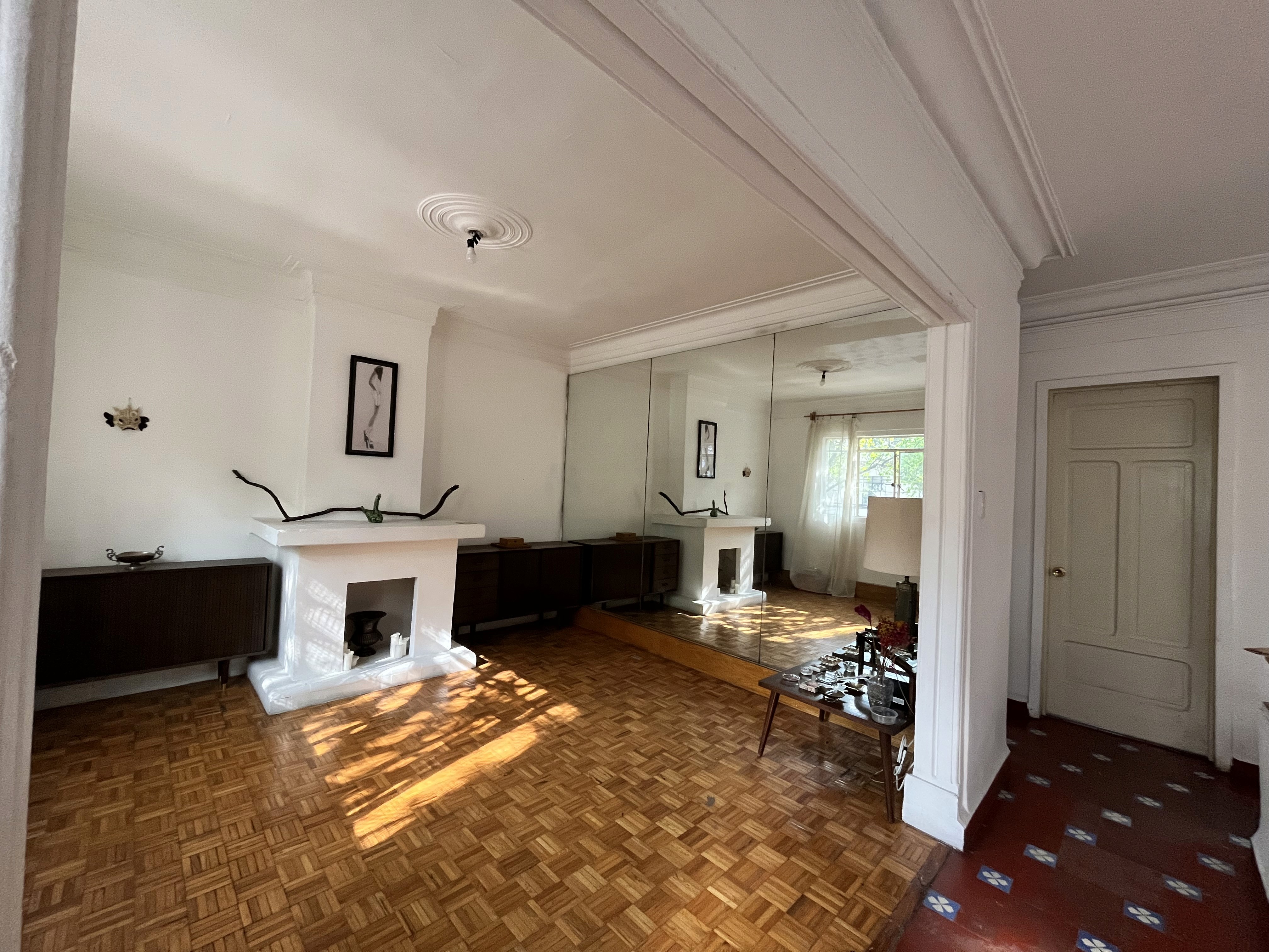 Descripción: Acogedor cuarto con pisos originales de parquet en madera, ventanal con vista a la calle que aporta mucha luz, espejo de piso a techo y chimenea.