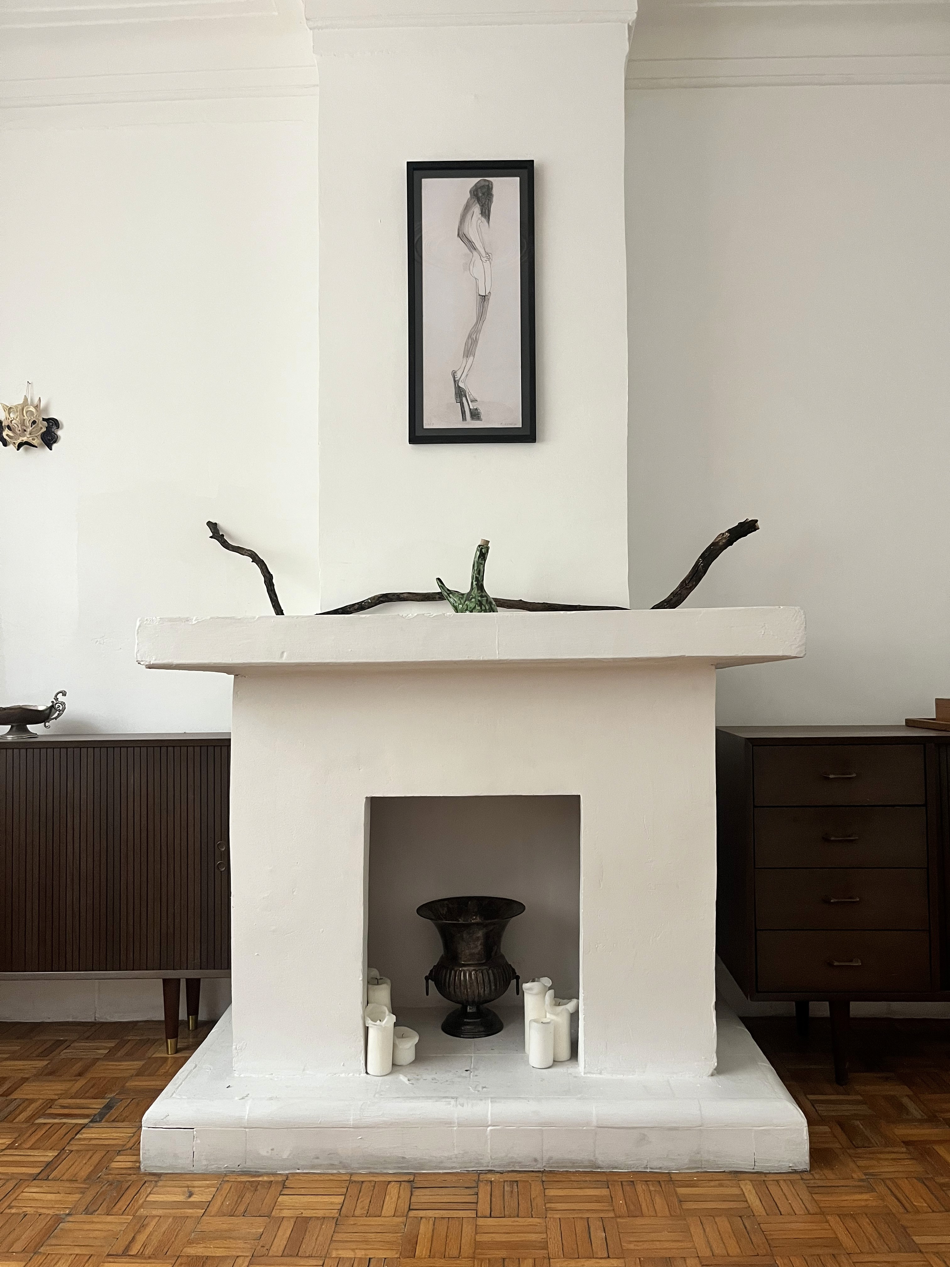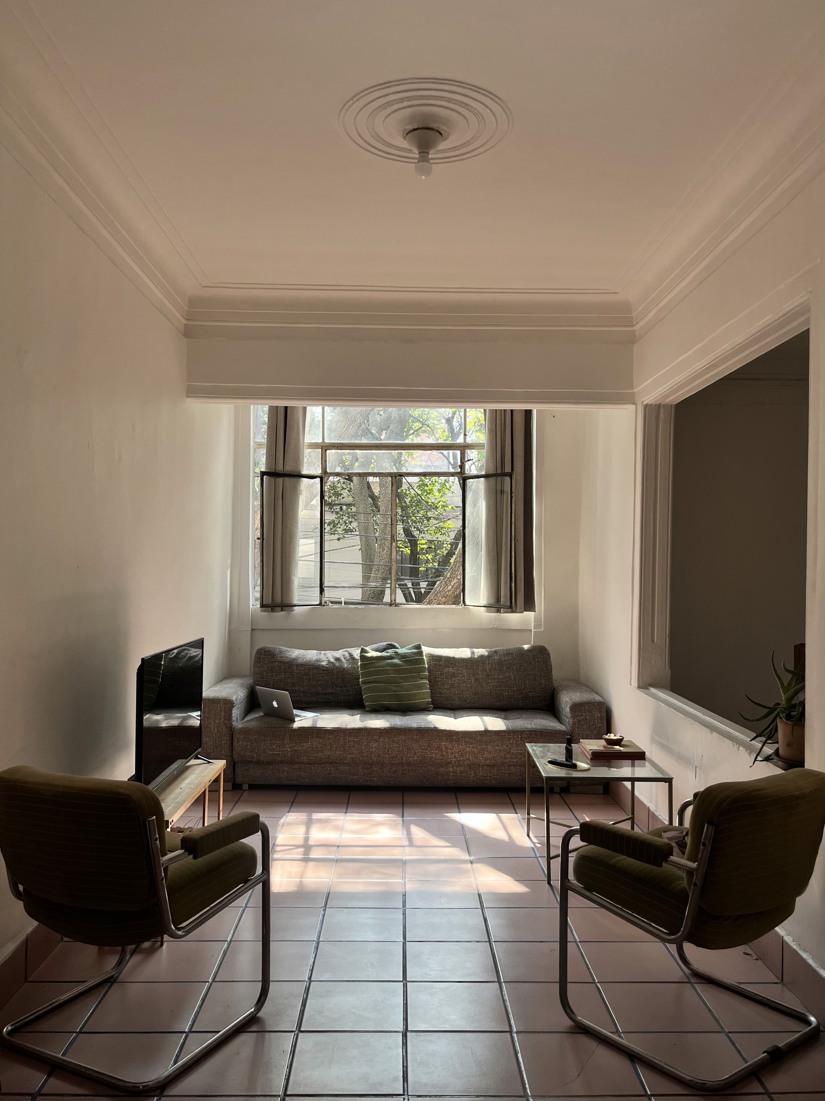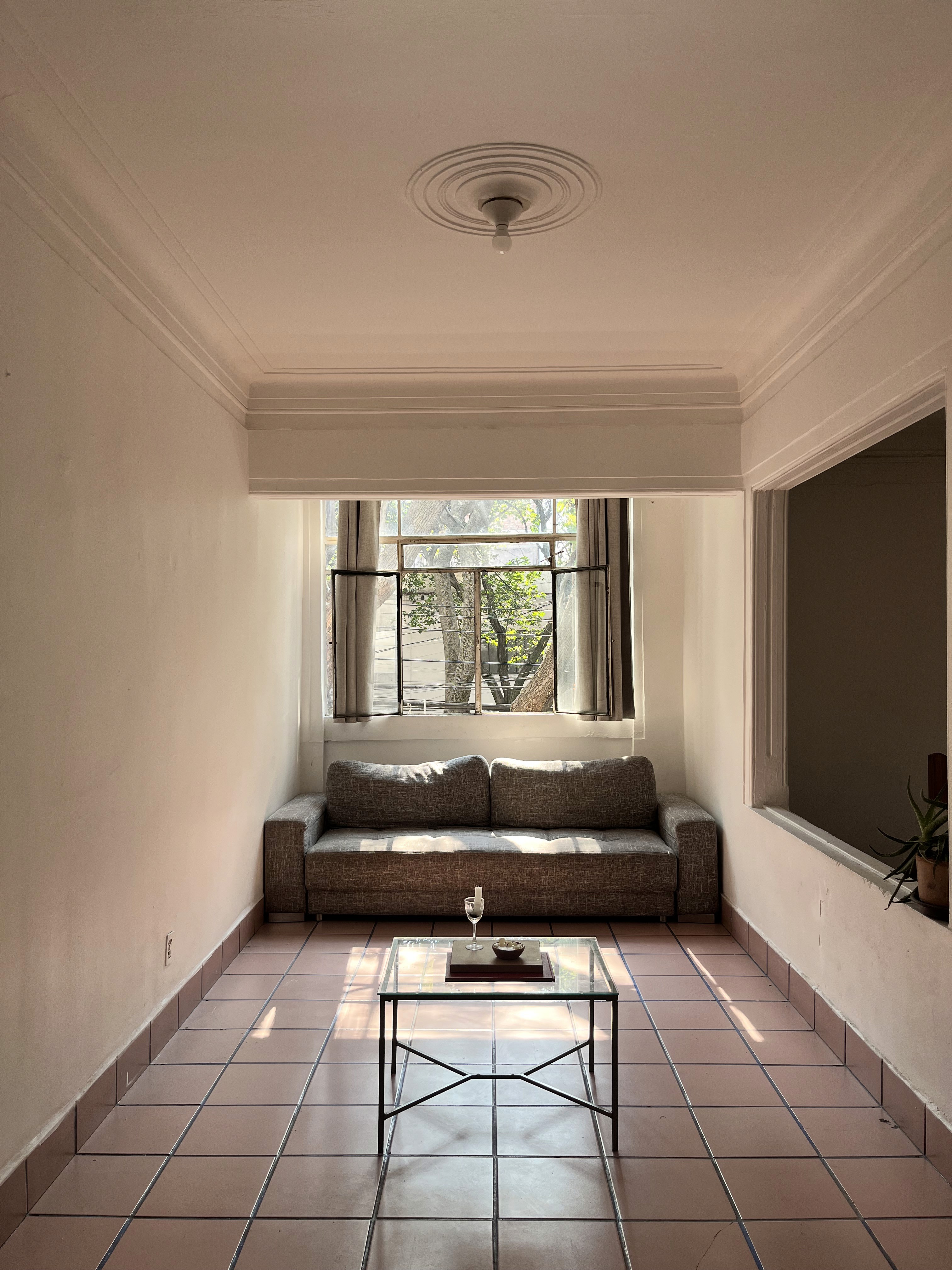 Descripción: Acogedor cuarto con pisos originales de parquet en madera, ventanal con vista a la calle que aporta mucha luz, espejo de piso a techo y chimenea.