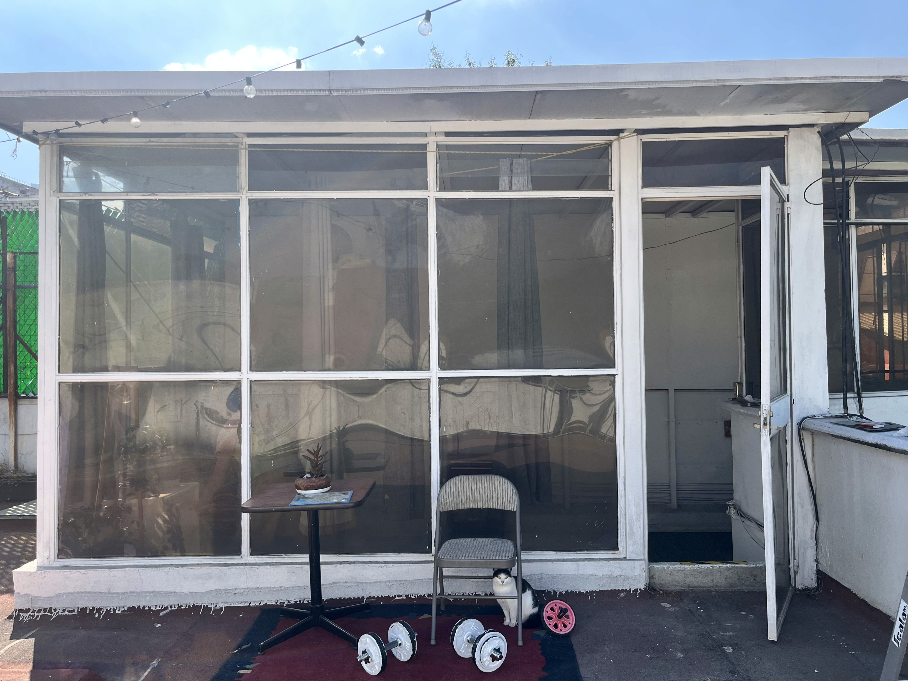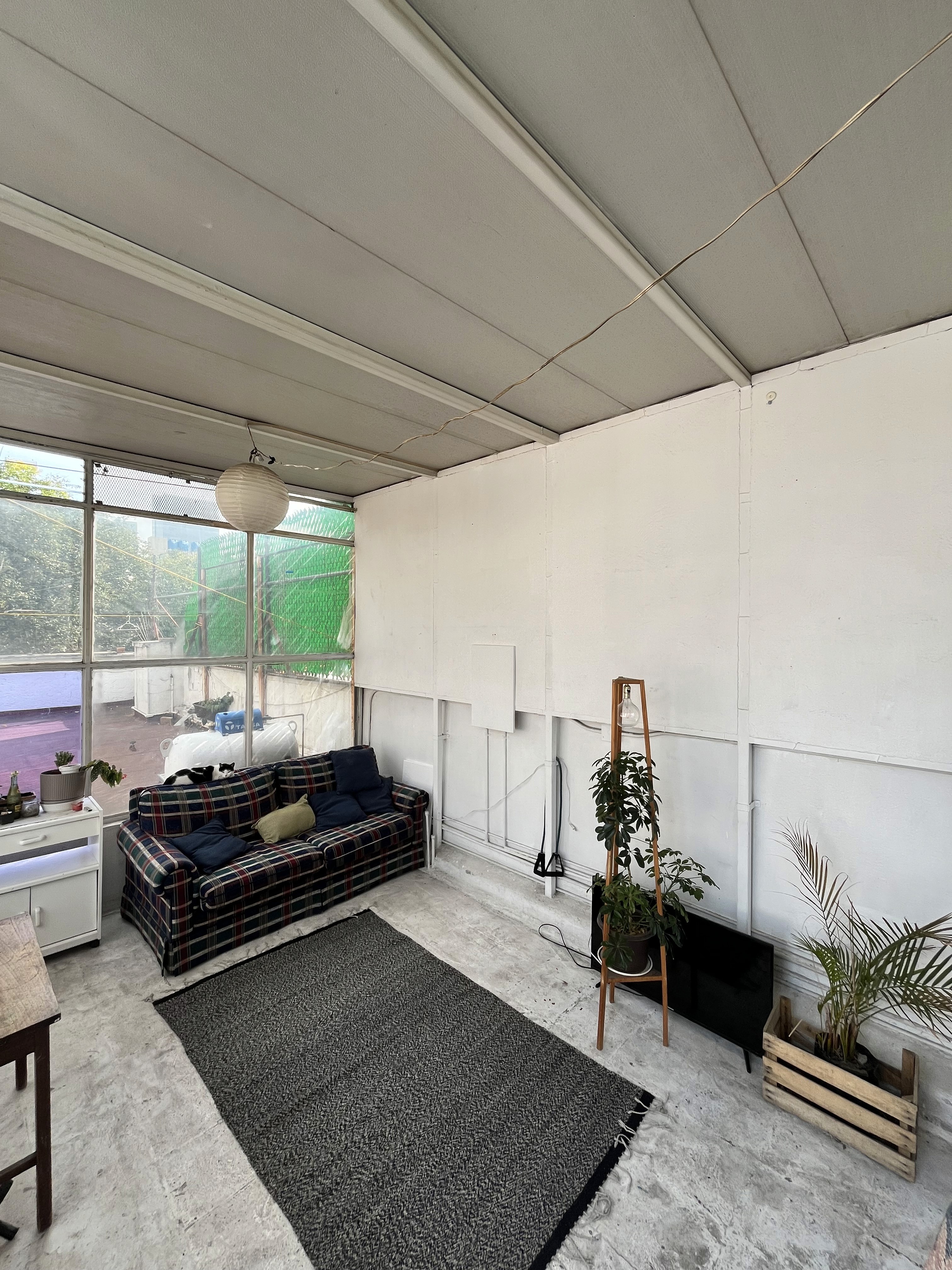 Descripción: Amplio cuarto ubicado en terraza para estadía o usos múltiples. La habitación cuenta con baño completo propio, acceso a la cocina y refrigerador. Incluye : sofá-cama matrimonial, escritorio, alfombras, clóset, TV y colchonetas aplicables. + Mesita desayunador externo, propias del cuarto.