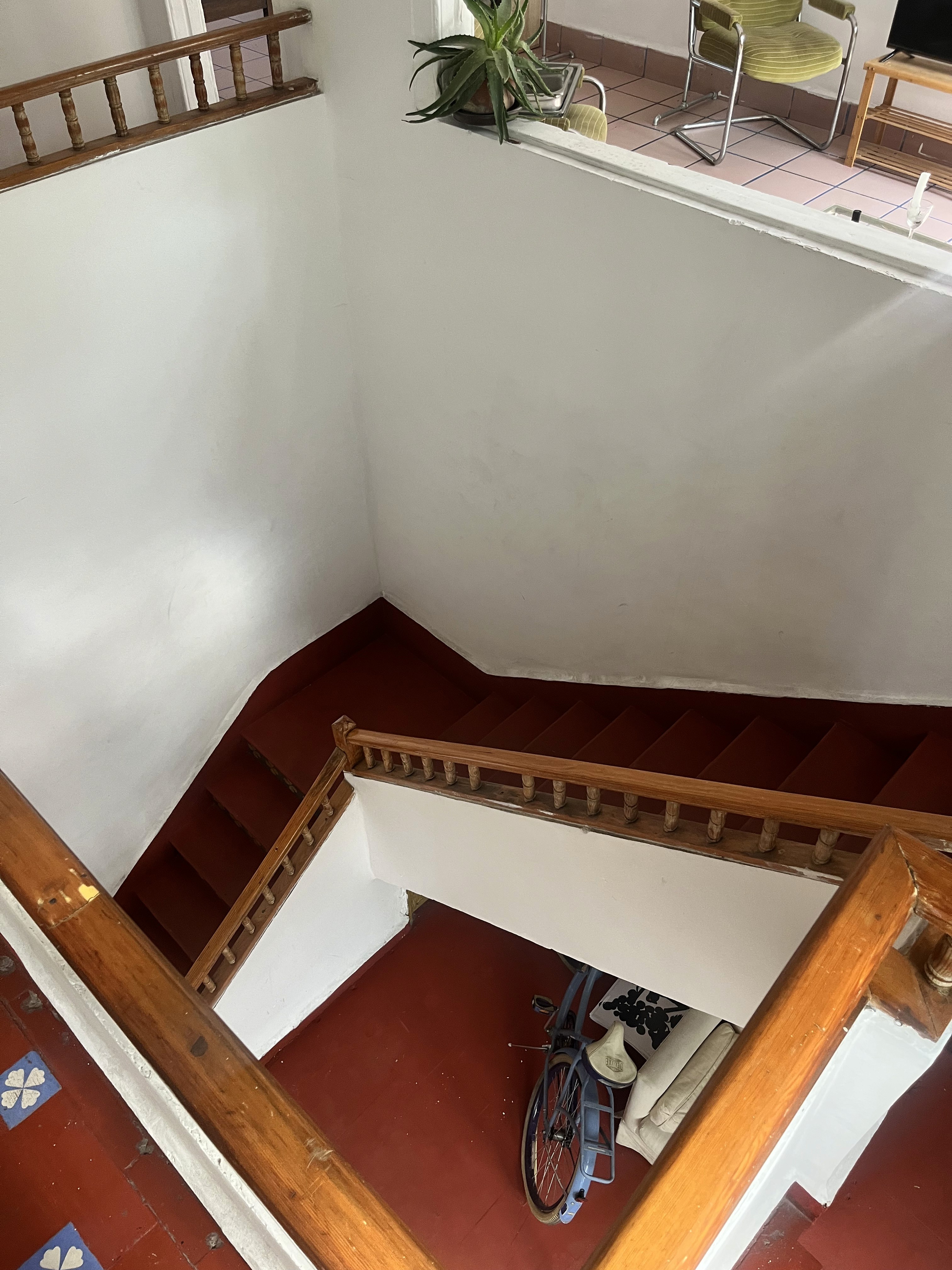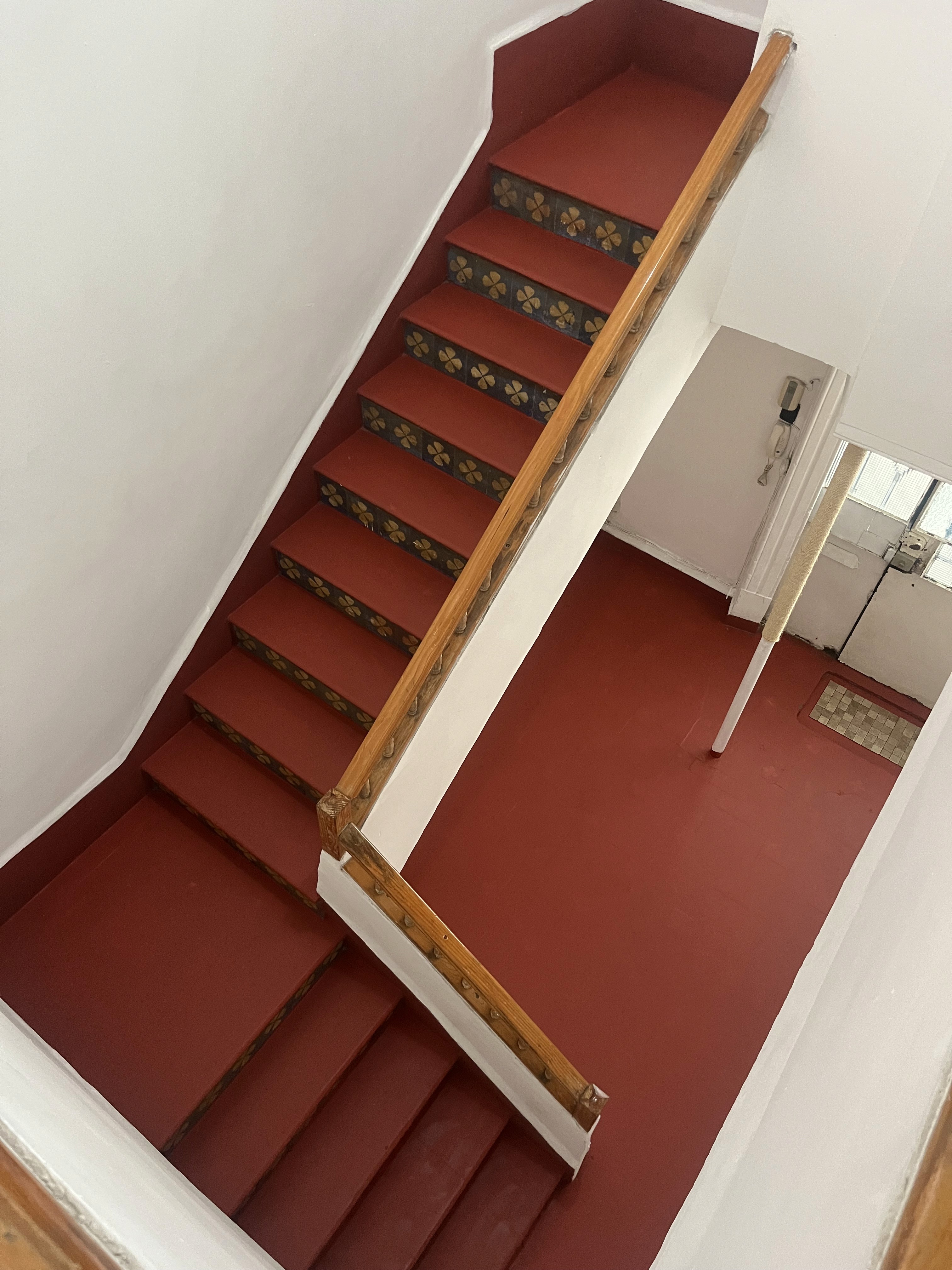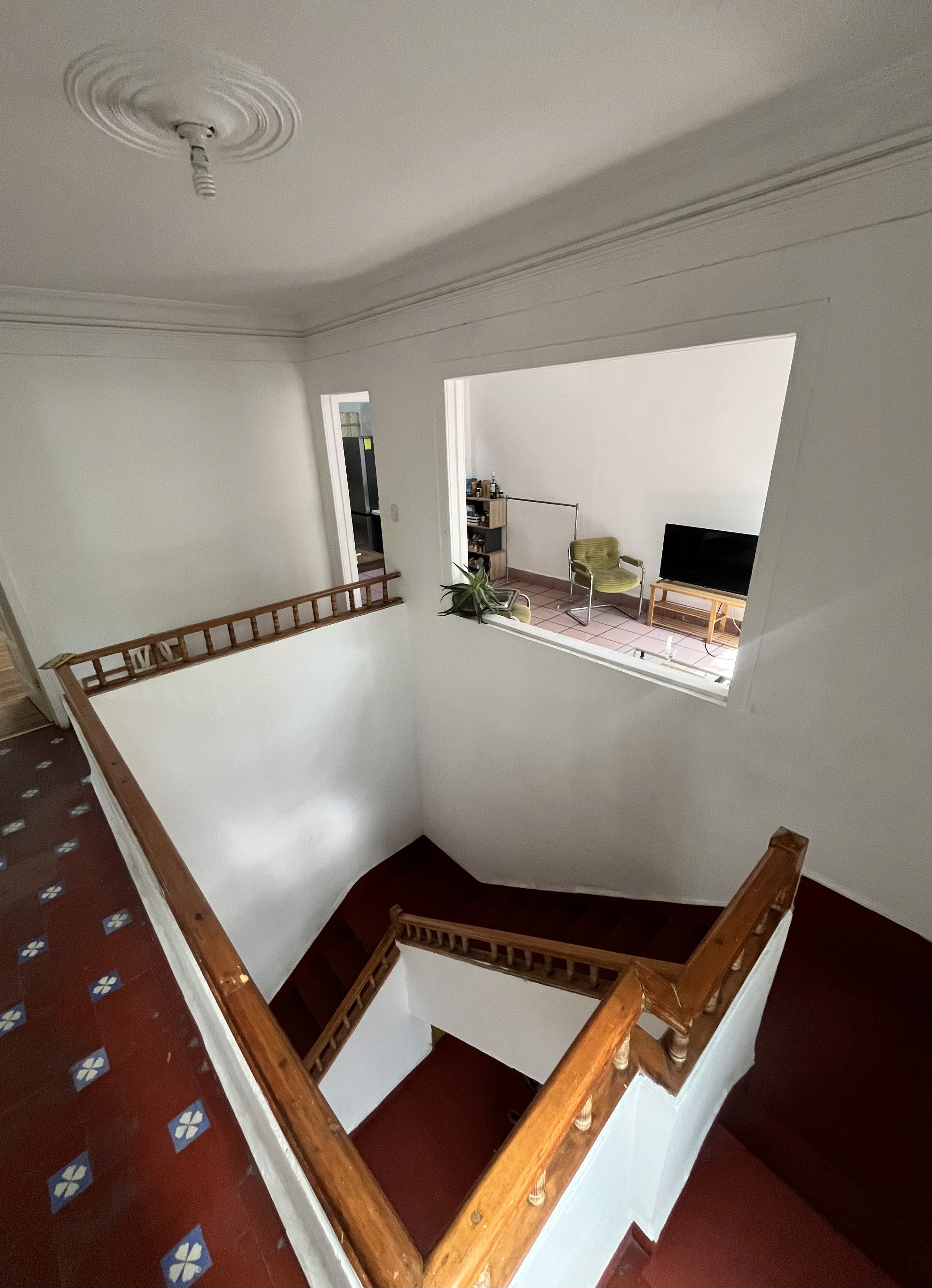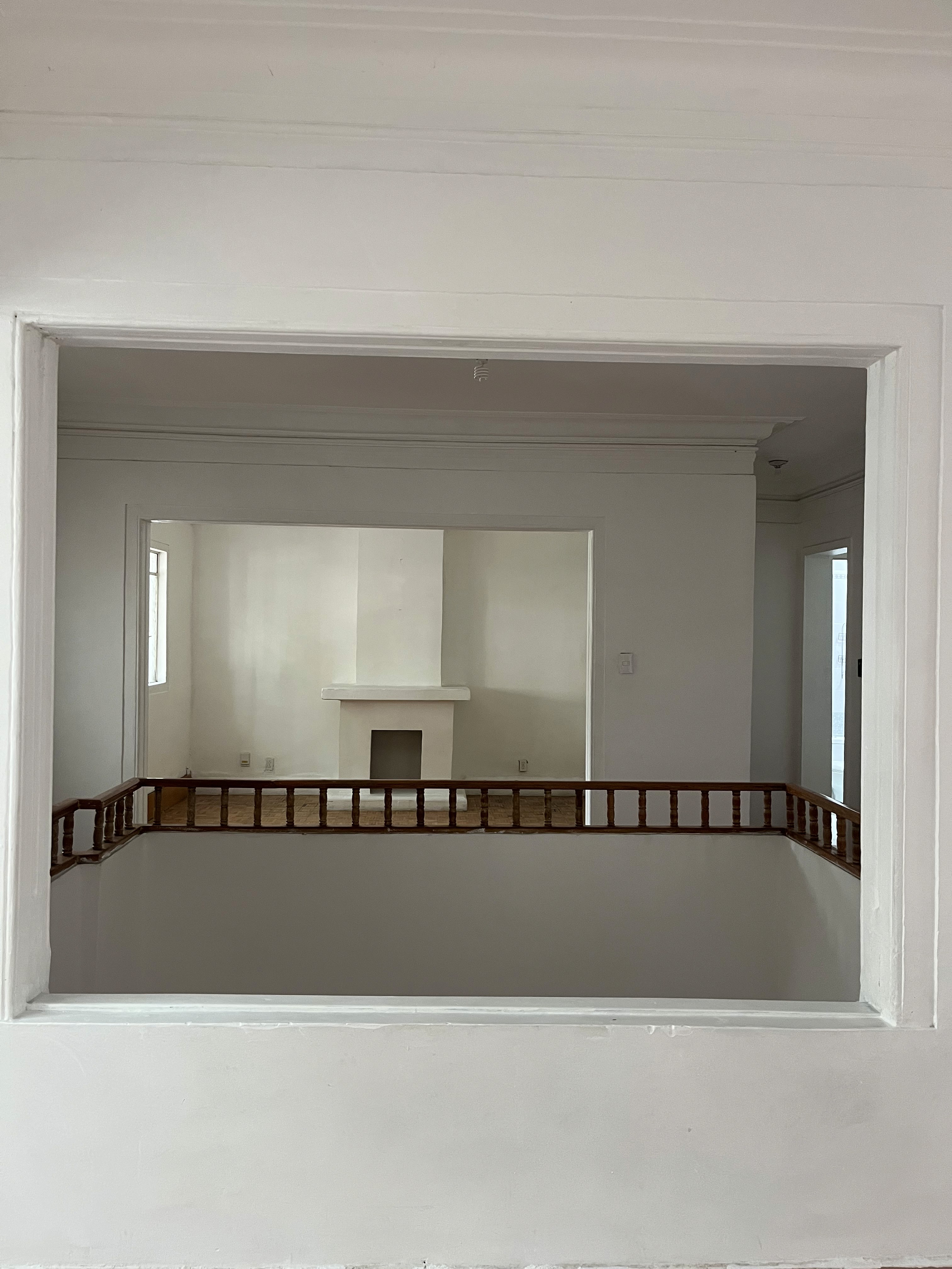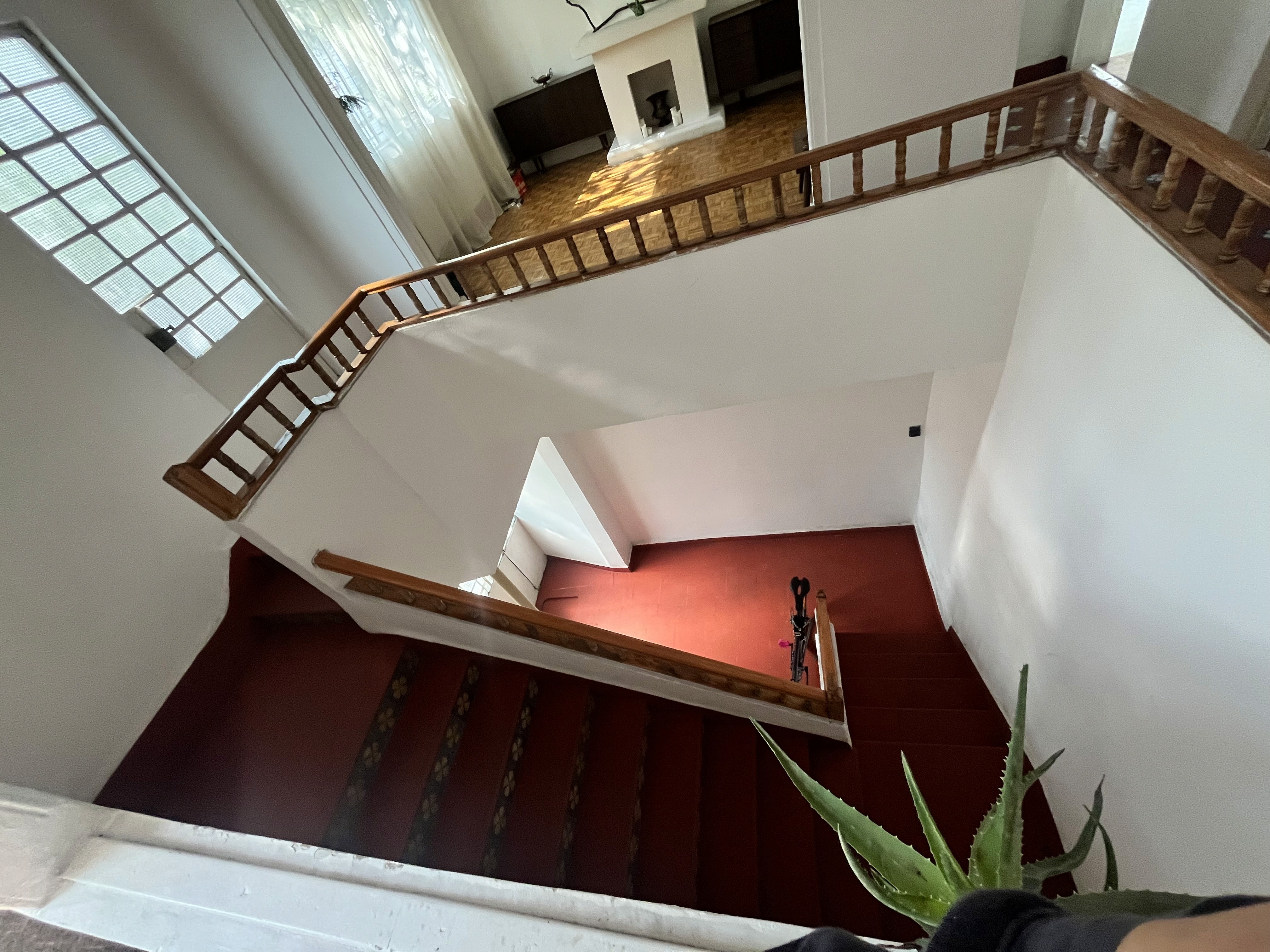 Descripción: Recibidor doble altura a pie de calle, escaleras estilo colonial y pasillo en forma de herradura, incluye un mini balcón, con vista a la calle y fachada de la casa.